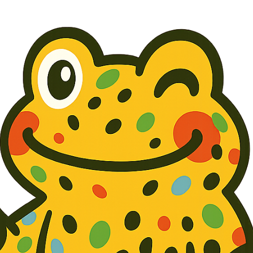 「毒ガエルくん」は、コラパのマスコットキャラクターです。鮮やかな黄色の体に、水色、赤、黒のカラフルな斑点を持つ、個性的で愛らしい姿をしています。