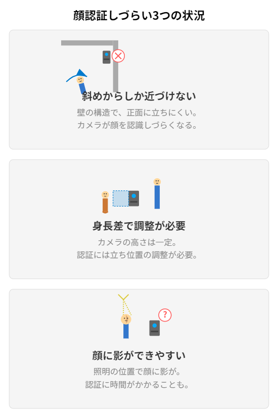 しかし、実際に運用してみると、「認証の際に少し体を傾ける必要がある」「身長の低い人が認証しにくい」といった、ささいながらも日々の業務におけるプチストレスを感じることはありませんか?